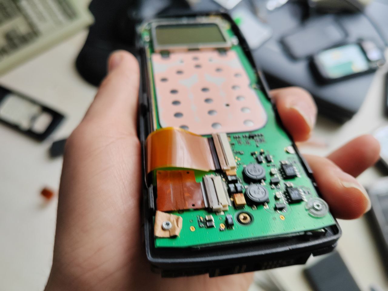 Шлейф для 9110 я опробовал сразу. Он получился чуть длиннее, чем нужно, и немного дыбится в верхней части коммуникатора. Но, похоже, что шлейф оказался вполне пригодным для использования. Победа, получается.