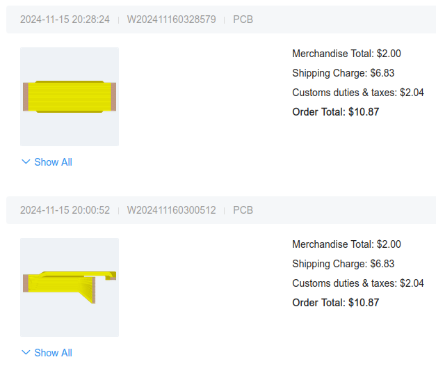 В конце концов, шлейфы были заказаны. Правда, оказалось, что "акция" с 2$ действует только на один шлейф в заказе, другой идет уже за обычную цену, поэтому пришлось их разбить на два заказа (да, это работает). С учетом доставки в ЕС изготовление каждого шлейфа обошлось мне в 10$ за партию из 5 штук.