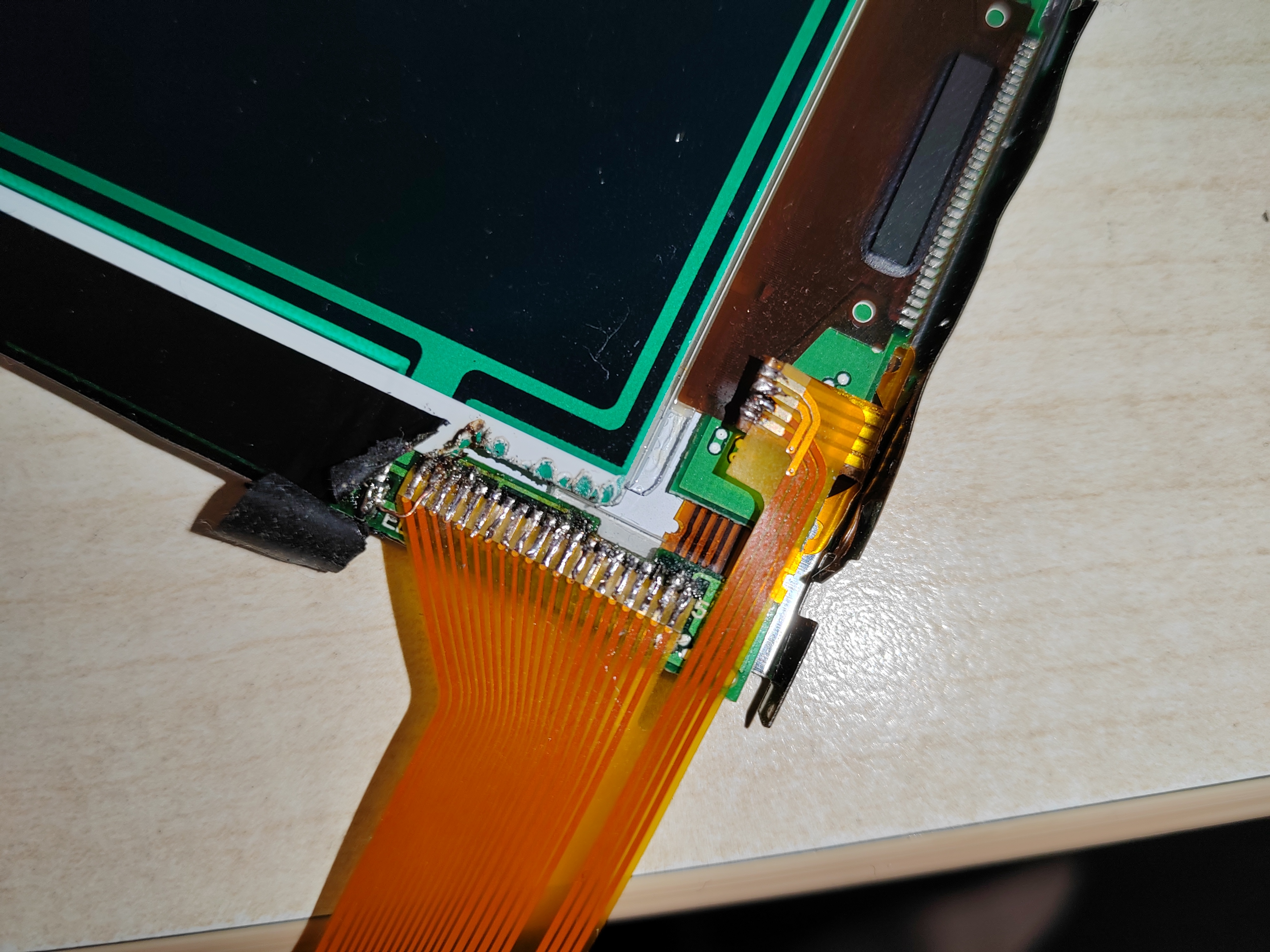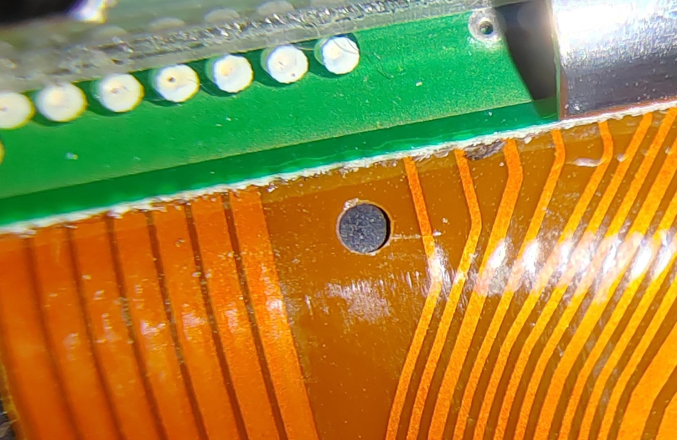 Изначально у меня была идея просто проложить медный провод вместо перебитой дорожки, но мои низкие способности к пайке угробили вторую сторону шлейфа, как видно на первой фотографии.