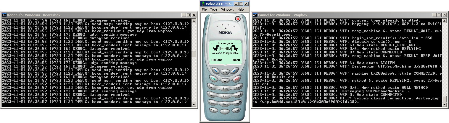 1. Немного WAP теорииДля чего же нужны такие серверные заморочки? Рассмотрим общую схему WAP соединения для CSD телефона (WAP over CSD):Как видно, телефон не способен получать данные напрямую с HTTP(S) сервера, на котором находятся страницы формата WML (хотя поздние WAP 1.x телефоны имели подержку и полноценных HTML страниц). Для начала ему, конечно, нужен Dial-in сервер с GSM модемом, с которым, посредством технологии CSD (Circuit Switched Data), телефон устанавливает соединение (звонит по номеру) и получает доступ в Интернет. Ранее такие "номера доступа" были у самих операторов (c оплатой за время пользования), однако сейчас (конец 2023 года) у большинства операторов Dial-in сервера отключены. Более того, в некоторых случаях оператор и вовсе отключает поддержку CSD в сети (при попытке позвонить звонок тут же сбрасывается), требуя подключения отдельной услуги (платной или бесплатной). В наиболее худшем случае у оператора и вовсе может не быть информации о CSD в его сети. Одно можно сказать точно - для организации своего Dial-in сервера необходима поддержка CSD со стороны вашего оператора сети - подробности по этому поводу нужно уточнять у него. В случае с телефоном, имеющим поддержку GPRS (WAP over GPRS) ситуация резко меняется в лучшую сторону. Из цепи исключается Dial-in сервер: Однако, в обоих случаях не исчезает необходимость во втором (и, пожалуй, основном) сервере. Речь о WAP-шлюзе. По сути, его задача выполнять всю "грязную" работу вместо мобильника. Первые телефоны с WAP были достаточно слабы, поэтому основную нагрузку по работе с DNS запросами, HTTP(S) сервером и компиляцией файлов WML/WMLScript в бинарный формат (для экономии трафика и оперативной памяти телефона, а также упрощения механизма парсинга в браузере устройства) возложили на шлюз. Как и Dial-in сервера, шлюзы ранее также присутствовали у операторов, а у некоторых имеются и до сих пор, но могут требовать использования специального APN профиля, трафик по которому стоит сильно дороже обычного GPRS. 2. Настройка WAP-шлюза Kannel: WindowsНастраивать свой сервер, конечно, не обязательно. Существуют бесплатные независимые WAP-шлюзы, для пользования которыми достаточно вписать их IP-адрес в профиль телефона. Список доступен на bs0dd.net/gateway_ru.Однако, для надежности и уверенности всегда полезно иметь свой сервер (необходим разве что публичный ("белый") IP адрес). Программное обеспечение WAP-шлюза в большинстве случаев было платным, стоило недешево и рассчитано было на операторов сотовой сети, окупавших шлюз средствами рядовых пользователей конечно же. Здесь выгодно отличается шлюз Kannel (www.kannel.org) с открытым исходным кодом. Пожалуй, единственный бесплатный шлюз. Он идеально подходит для нашего случая. К сожалению, официально Kannel не имеет сборки для Windows, поэтому пришлось собрать комплект самому. Скачать можно на подсайте winkannel.bs0dd.net. Для загрузки рекомендуется версия 1.4.5. Установка достаточно проста. Распаковываем архив в любое место. Нас интересует скрипт startwap.bat, он запускает модули Bearerbox (модуль-ядро) и Wapbox (WAP-модуль). Базовая конфигурация уже записана в файл kannel.conf. Более тонко шлюз можно настроить по инструкции на официальной странице: www.kannel.org/userguide.shtml. Запускаем скрипт и видим перед собой две консоли. Kannel запущен и готов к работе. 3. Настройка WAP-шлюза Kannel: LinuxВ совместимых с Debian дистрибутивах ситуация обстоит еще проще - Kannel доступен для загрузки через пакетый менеджер APT. Достат