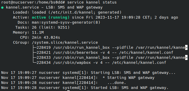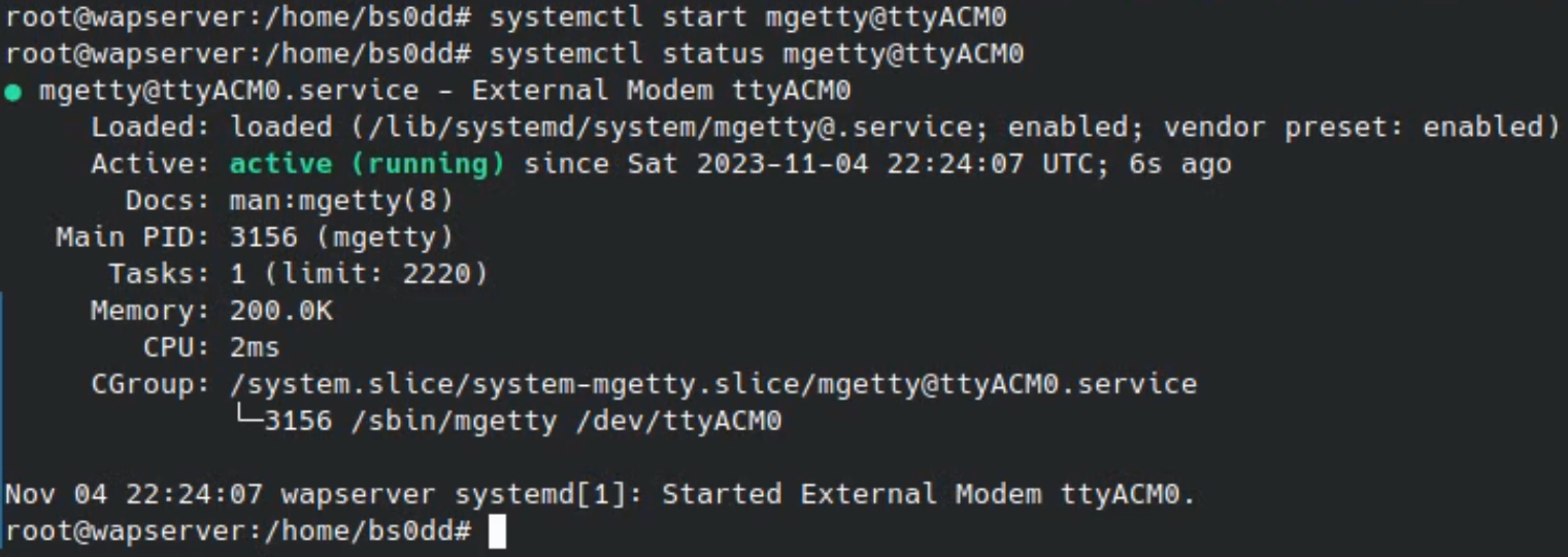 В моем случае названием службы будет mgetty@ttyACM0. Для запуска службы используется ключевое слово start (и stop для остановки):