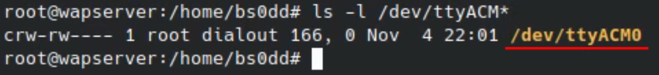 Как видно, телефон определился системой (подчеркнут красным цветом). Теперь нас интересует COM-порт, назначенный системой для модема телефона. В Linux портов в привычном нам понимании не существует. Есть лишь "файлы", при записи и чтении которых фактически идет работа с COM-портом. Назову их файл-портами. Обычно, в случае с телефонами на USB их модемам назначаются файл-порты /dev/ttyACM* или /dev/ttyUSB*, где * - цифра от 0. В случае с использованием телефона, имеющего COM кабель, его модем должен быть доступен (если это предусмотрено) на файл-порте реального COM, обычно /dev/ttyS* или /dev/ttyUSB* (если COM кабель подключен через USB адаптер). Проверим наличие порта: